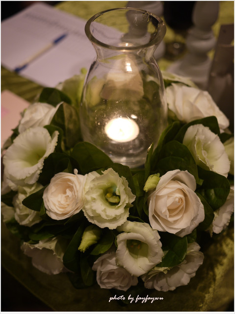 是以綠色佈景和白色玫瑰搭配出清新典雅的自然風格